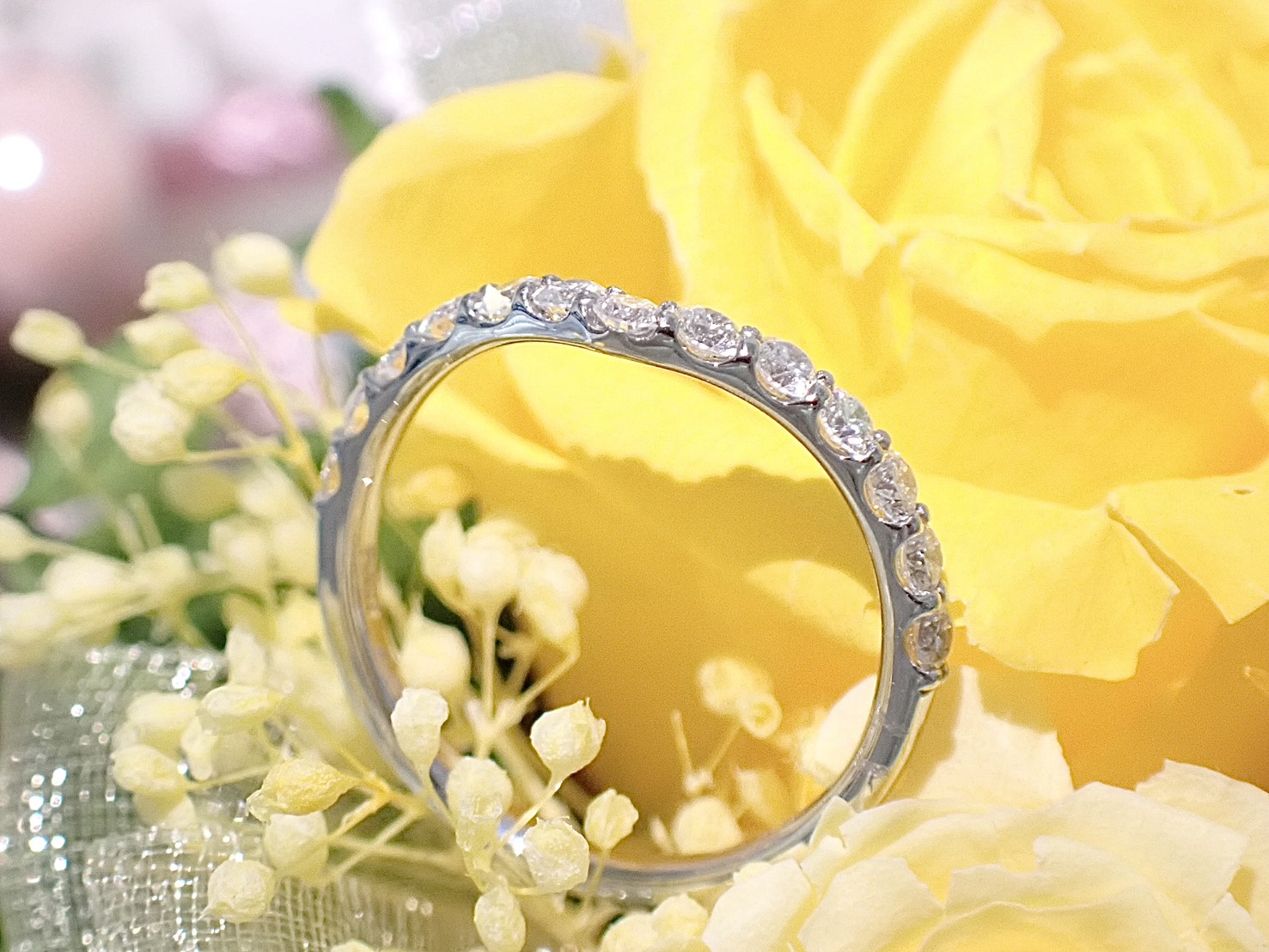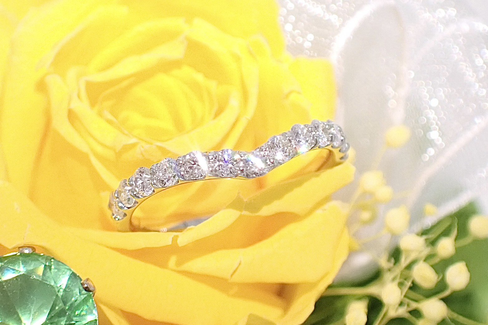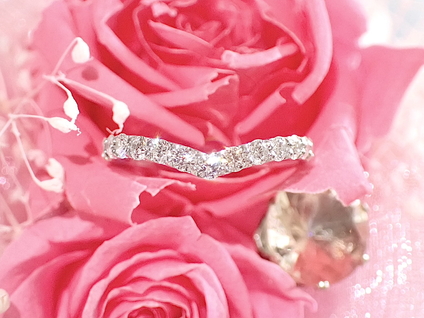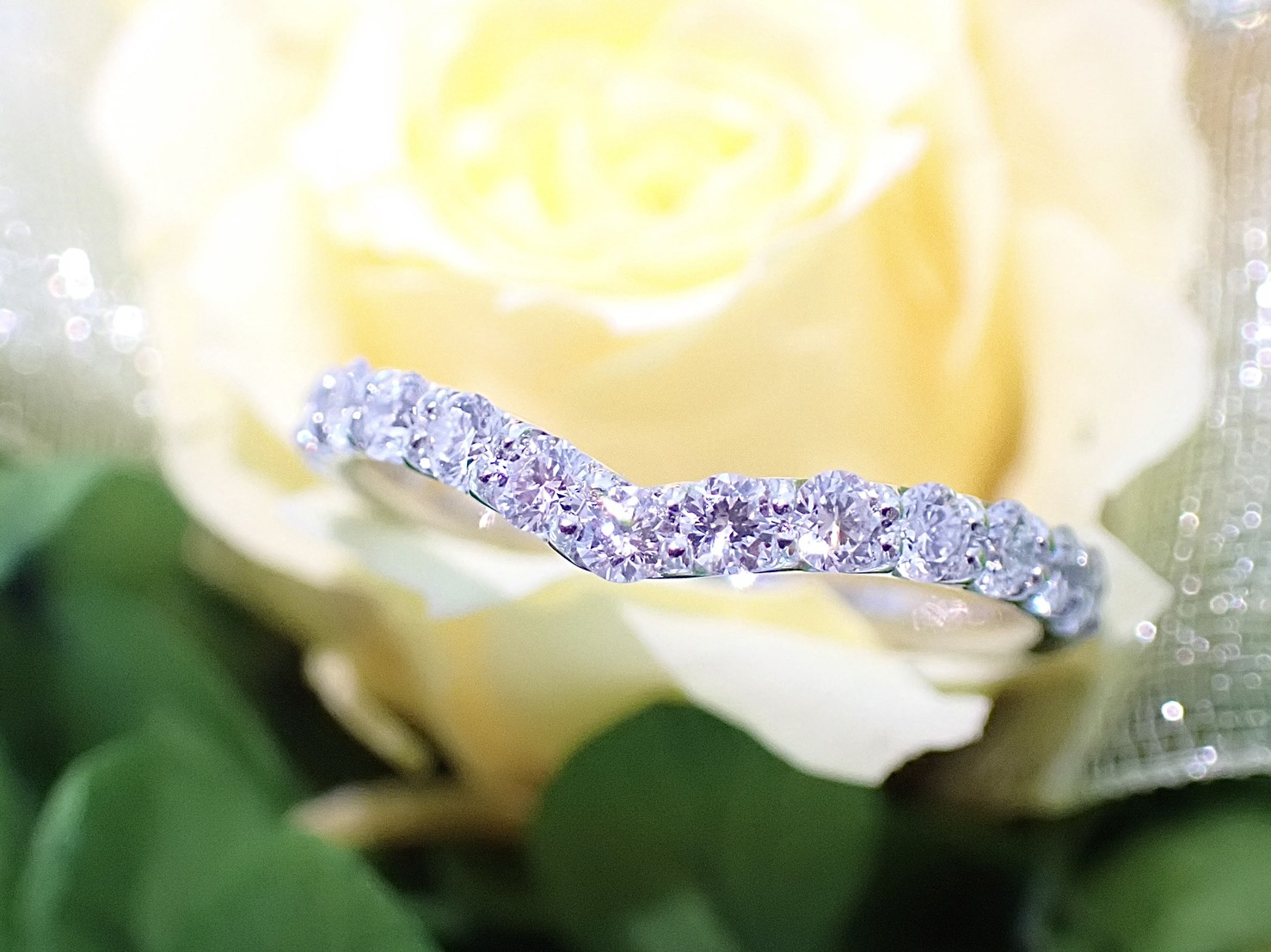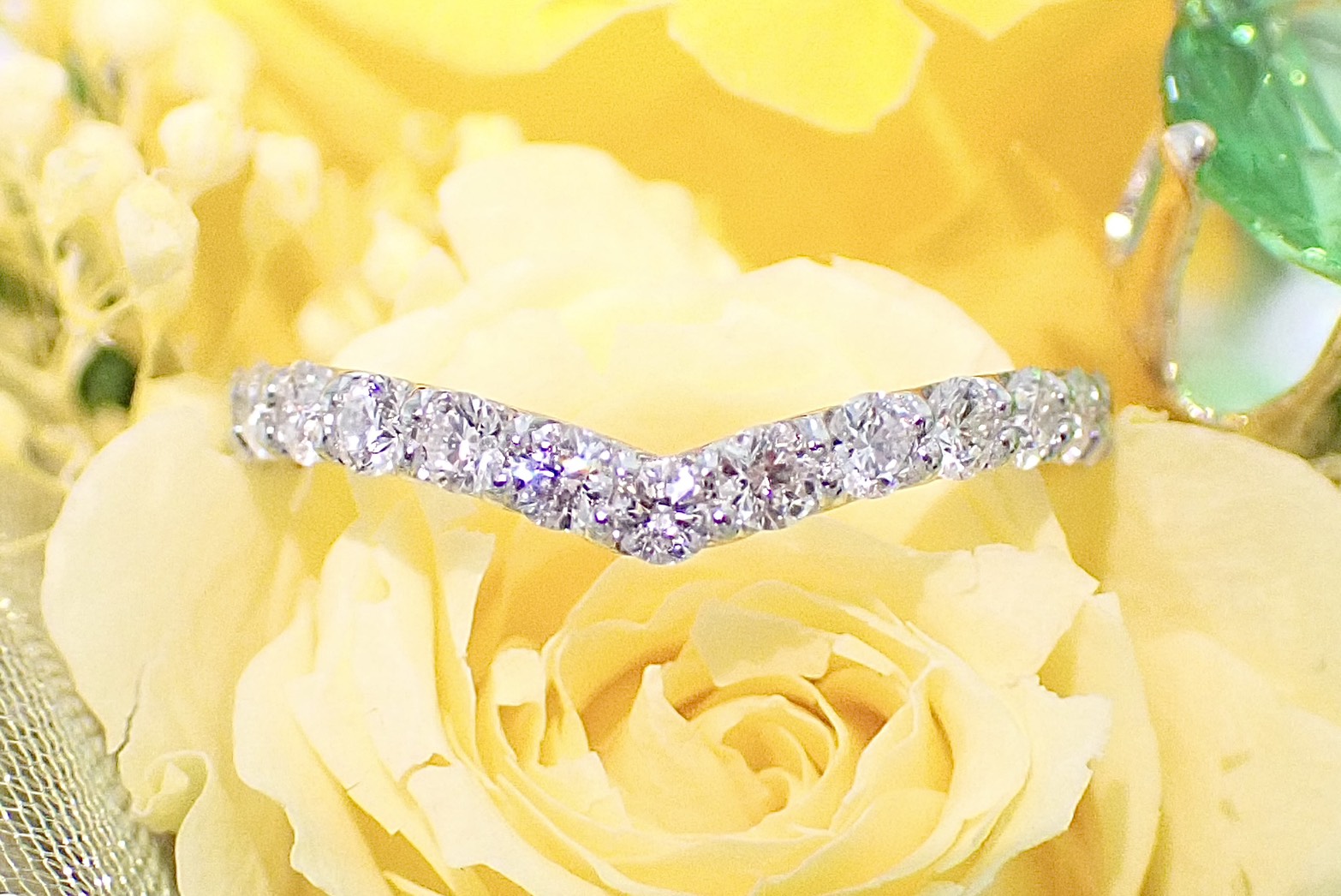 高さを抑えたシンプルなV字のハーフエタニティリング。